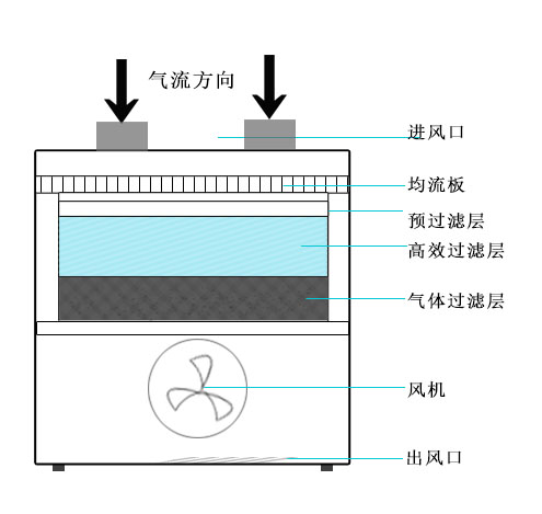 2.主過濾層過濾梯度設(shè)置:初中效過濾+HEPA高效過濾。凈化顆粒直